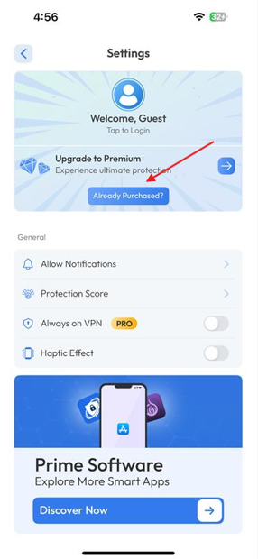 Alternatively, navigate to the Settings screen and tap "Already Purchased?".
