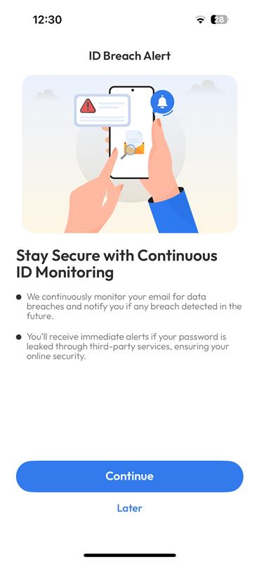 Regularly scan your device for hidden apps, malicious tools, or suspicious behavior that may compromise your privacy.Enable ID Breach Monitoring