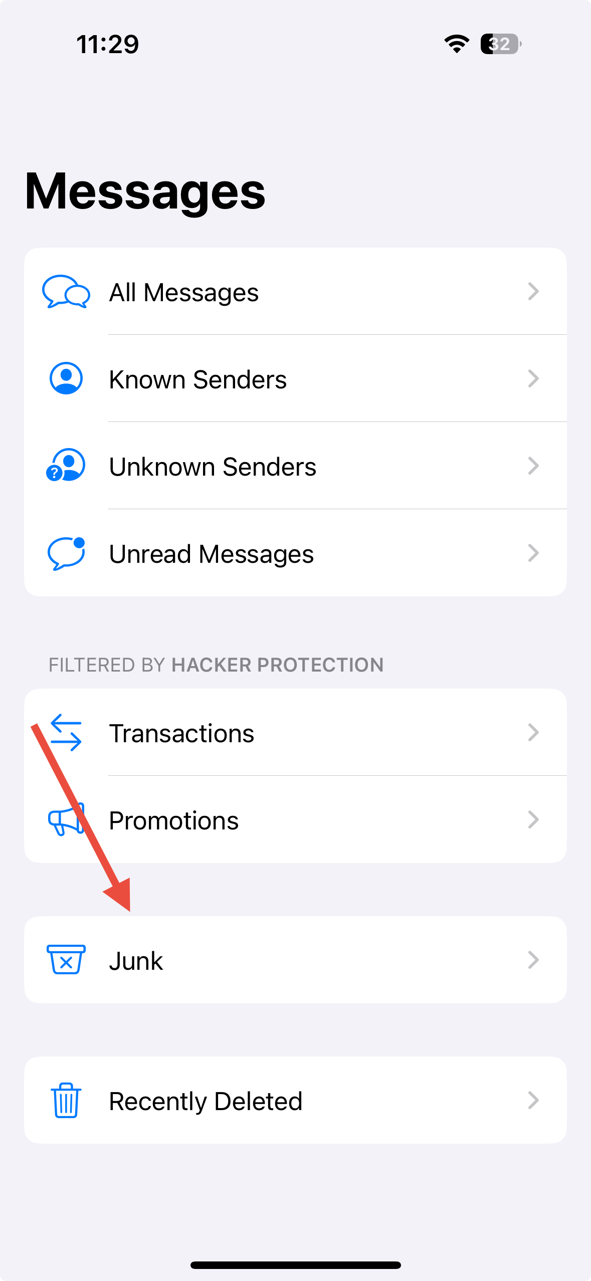 Select the Junk folder to view spam messages.